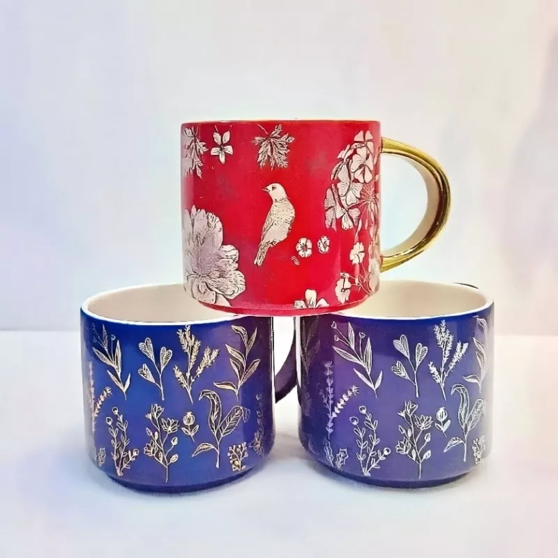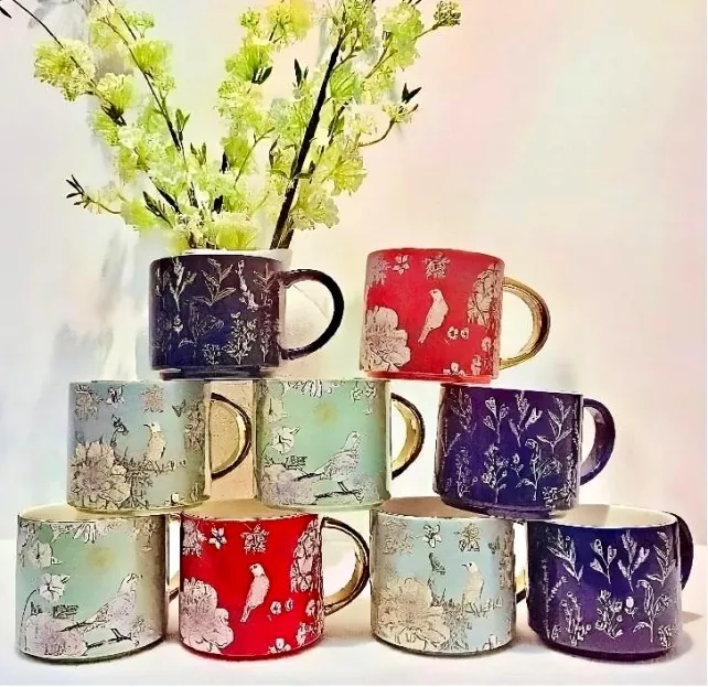 Denna keramiska mugg med elektropläterat guldhandtag, noggrant utformat med dekaler, förkroppsligar en unik charm inspirerad av naturen. Oavsett om det är de känsliga strukturerna av blommande blommor, de livliga formerna av smidiga fåglar eller de fängslande mönstren för naturliga färgblock, fångar muggen delikat gåvorna från flora, fauna och livliga färger. För att passa varje stil är muggens handtag anpassningsbart. Den guldpläterade versionen lyser med en rik, gyllene nyans som liknar 18k guld och lägger till en touch av sofistikering. Det kan också anpassas efter din favoritfärg.