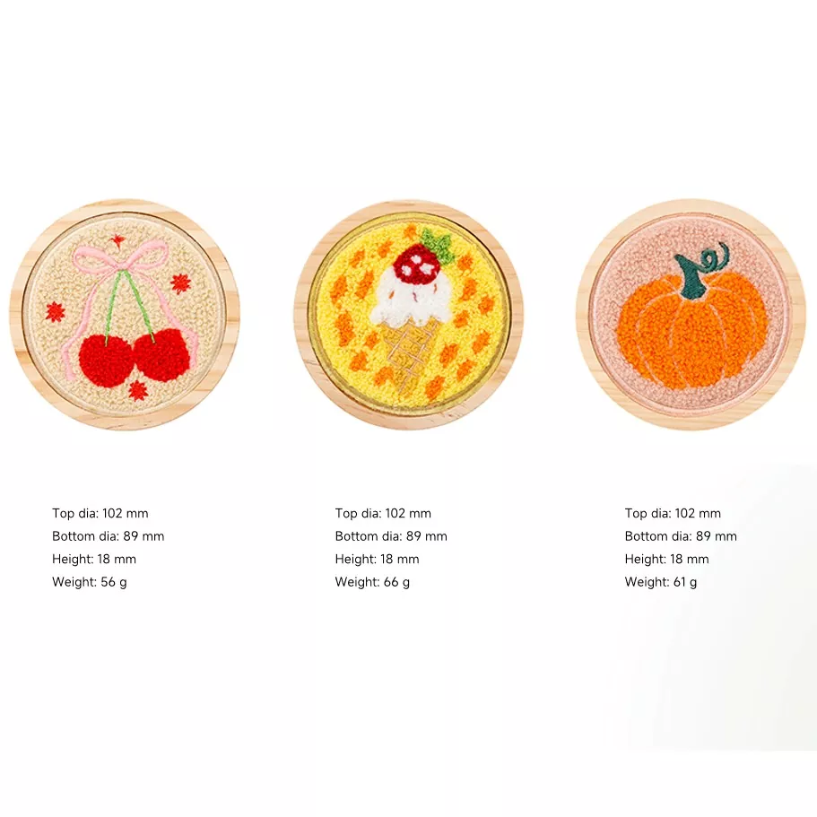 De söta handgjorda, miljövänliga trälocken som vi gör har alla standarddimensioner: 102 mm toppdiameter, 89 mm bottendiameter och 18 mm höjd. Vikterna varierar dock något: 51G, 53G, 56G, 58G och 60G. Om du har en specifik storlek eller mönster i åtanke, känn dig fri att meddela oss! Vi kommer att se till att allt, från pris till produkt, är perfekt skräddarsydd efter dina behov.