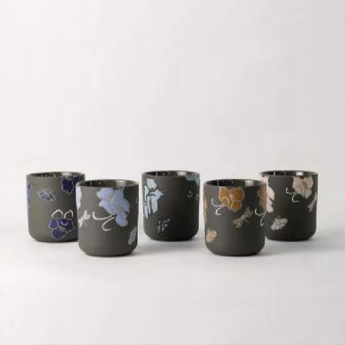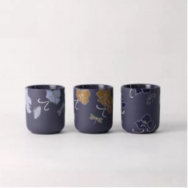 Den Floral Whisper handmålade konstljusstaken blandar österländsk estetik med praktisk design. Ett urval av livfulla färger, inklusive varm gul, tyst blå, elegant grå, djuplila och varm brun, sträcker sig från levande till dämpad, lätt att anpassa till alla utrymmen och humör. Ljusstakens kropp använder underglasyrmålningstekniker för traditionella blom- och gräsmotiv, utsmyckade med guldfolie. Designen är tidlös och miljövänlig. Den keramiska kroppen är mjuk, bekväm att hålla i och erbjuder utmärkt värmeisolering. Designen hämtar inspiration från klassiska japanska element, som utstrålar elegans och charm mitt i den pulserande naturen. Koppen är liten och utsökt, med en kapacitet lämplig för te, kaffe eller desserter. Den kan användas ensam för att försköna det dagliga livet, eller den kan kombineras med flera koppar för att flexibelt möta behoven hos familjeunderhållande gäster eller personlig njutning.