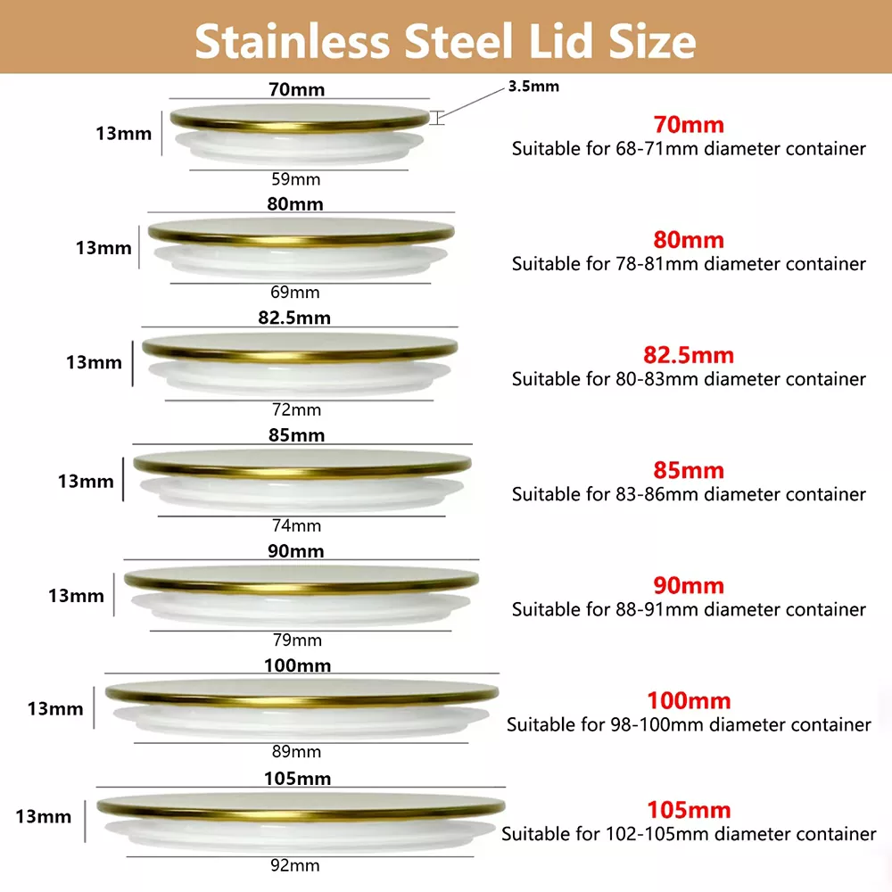 Våra skärmstrycket i rostfritt stålljusburklock finns i olika storlekar, alla med en total höjd på 13 mm. De specifika dimensionerna och kompatibla behållaröppningar visas nedan: